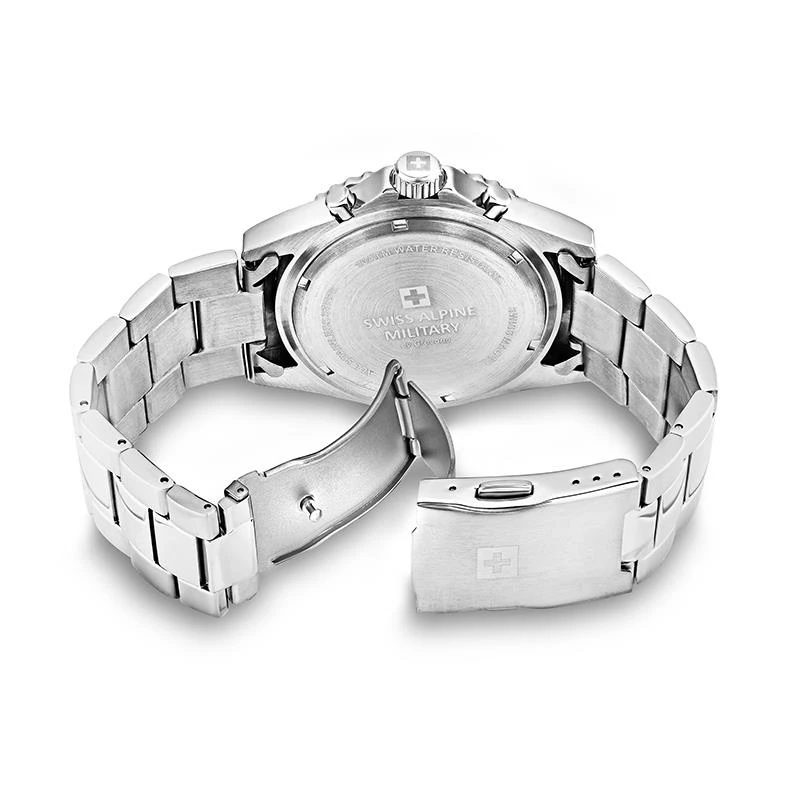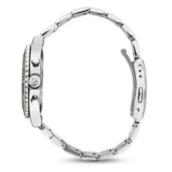 - Stainless steel case, caseback, crown and band