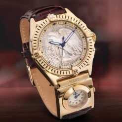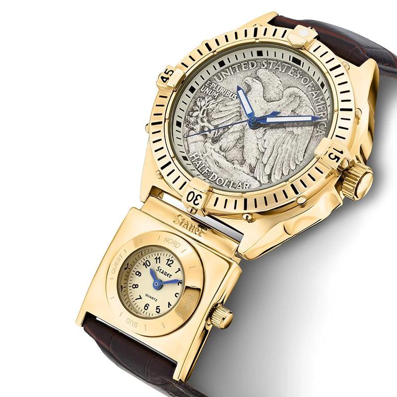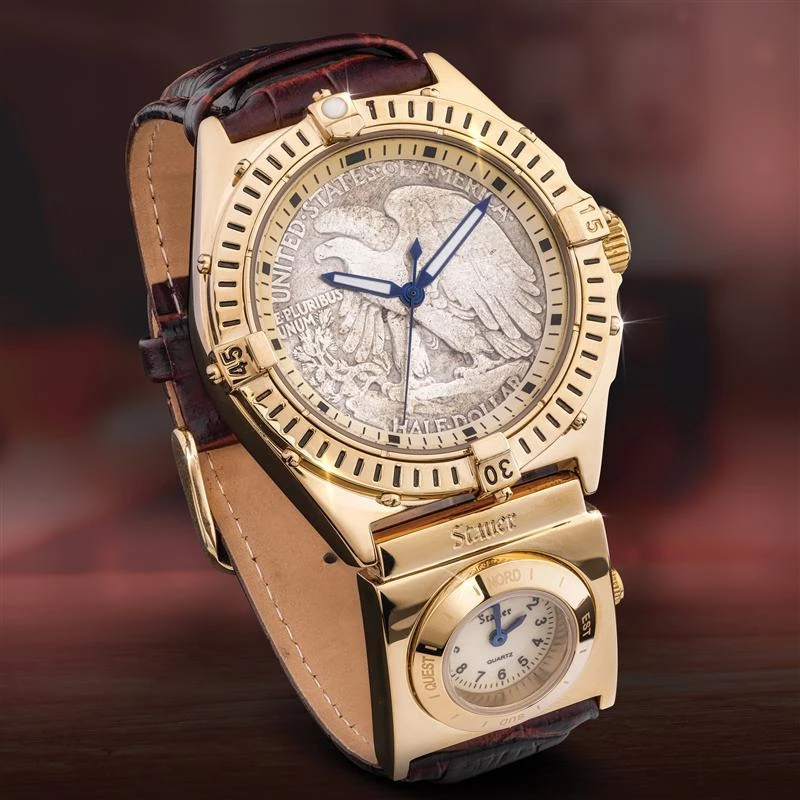 The Eagle Eye Dual Time Watch features the reverse of the Walking Liberty half dollar