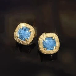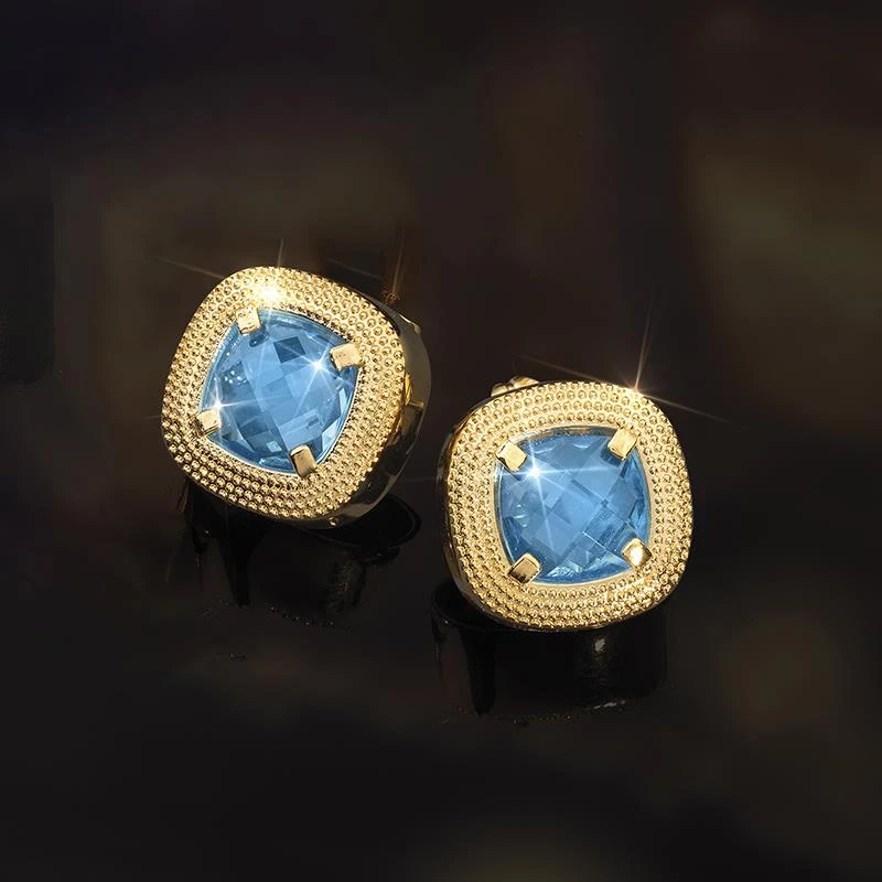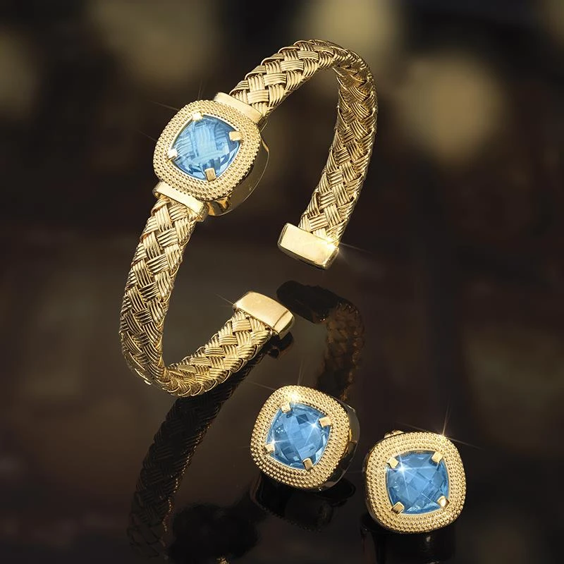 This method of cutting increases a gem’s surface scintillation and luster. Rock it back and forth and you’ll see its facets flash off and on like the lights on a Christmas tree. We’re so inspired by this cut that we’ve used it to create our Italian Crystal Collection. This bangle and earring set features stunningly blue European crystal in a checkerboard cut.