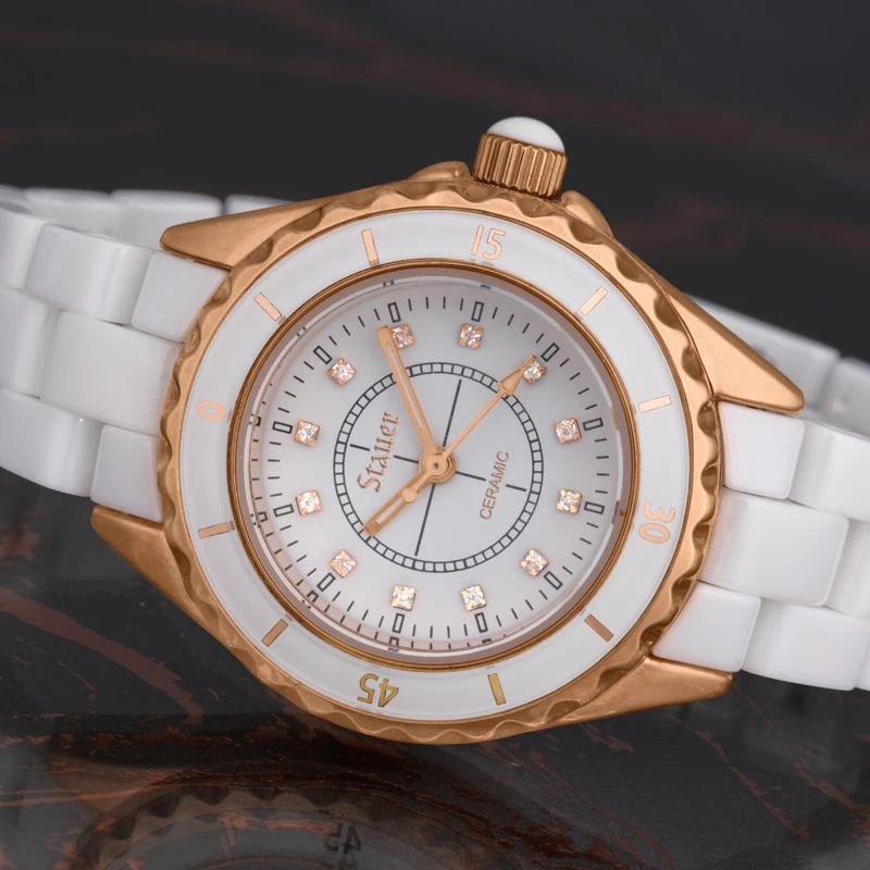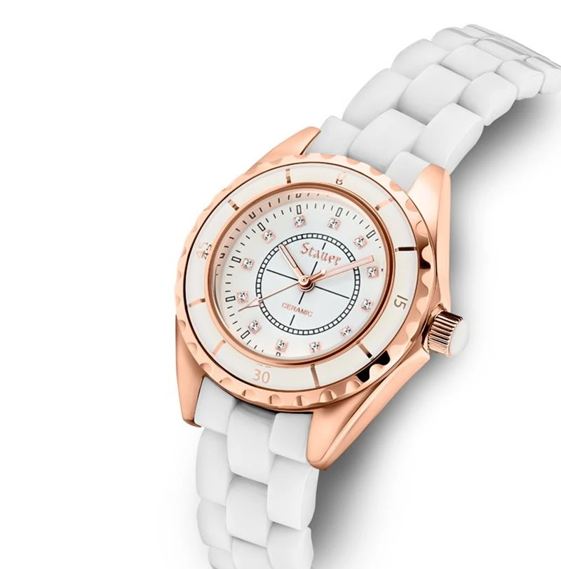 Made from ceramic, its durability and wearability defines its nature. Ceramic is lightweight, tough and incredibly scratch-resistant. The luxurious rose-gold finished bezel crystal studded hour markers elevate this beauty to an everyday companion that goes effortlessly from errands to dinner without missing a beat. Crafted with precision movement and water resistant to 3 ATM, the Elegante is as functional as it is fashionable.