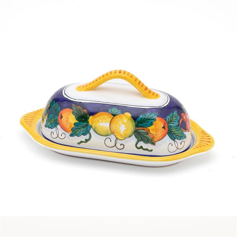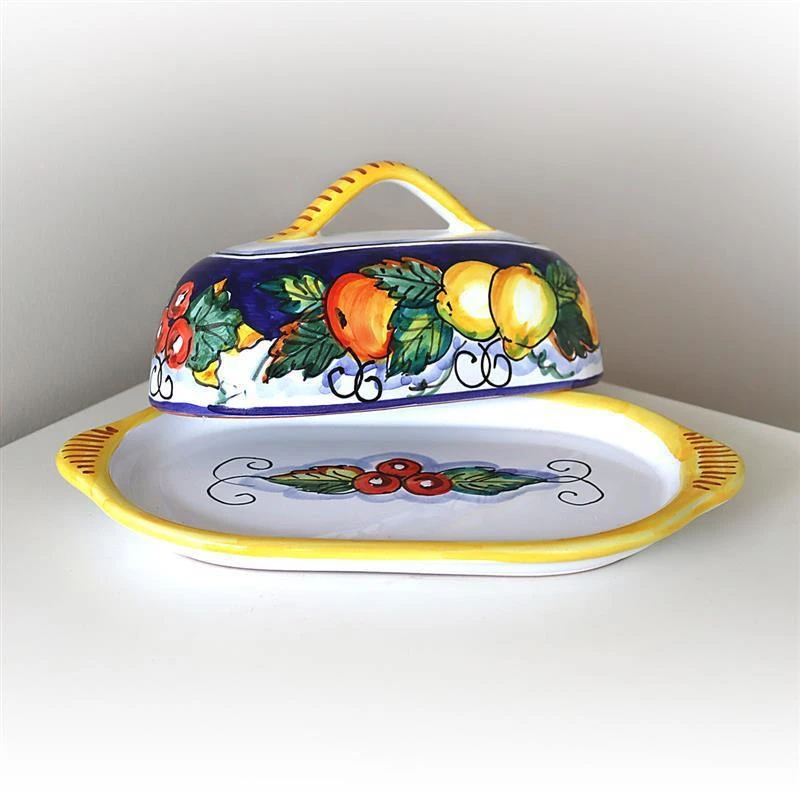 One of Deruta’s most famous motifs involves colorful lemons, berries and grapes against a blue, white and orange background. This motif has inspired our Limone Butter Dish. Made in Italy by some of the country’s finest craftsmen and dishwasher safe, the Limone Butter Dish provides a festive backdrop for entertaining, and represents the pinnacle of Italian ceramic artistry.