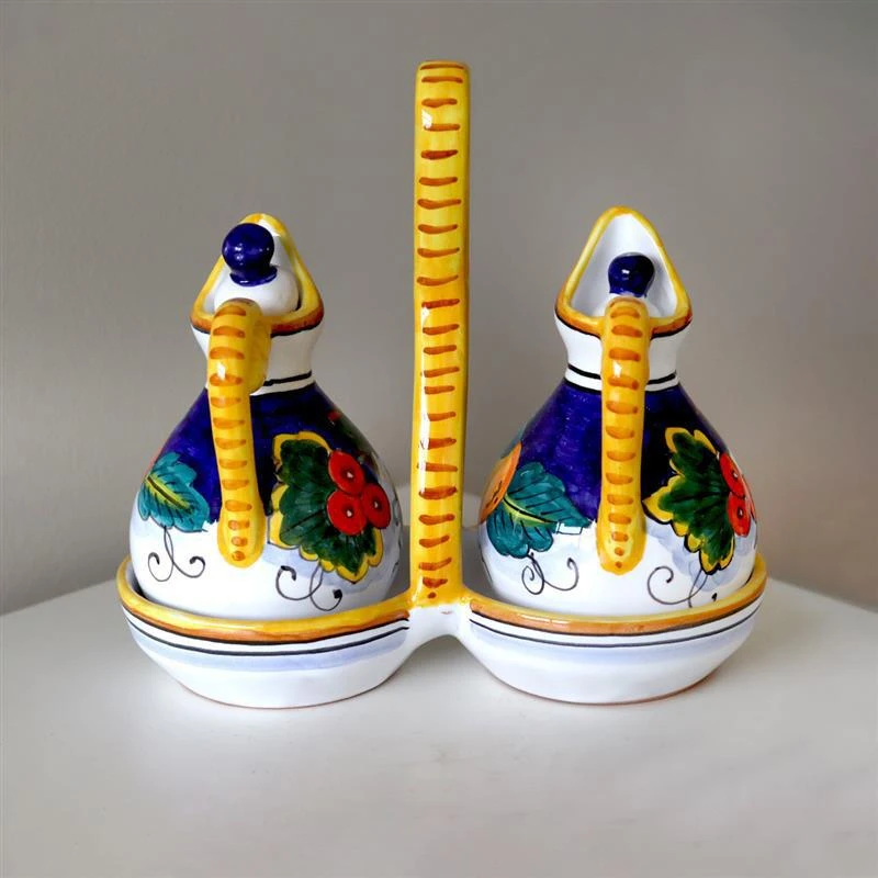 One of Deruta’s most famous motifs involves colorful lemons, berries and grapes against a blue, white and orange background. This motif has inspired our Limone Oil and Vinegar Set. Made in Italy by some of the country’s finest craftsmen and dishwasher safe, the Limone Oil and Vinegar Set provides a festive backdrop for entertaining, and represents the pinnacle of Italian ceramic artistry.