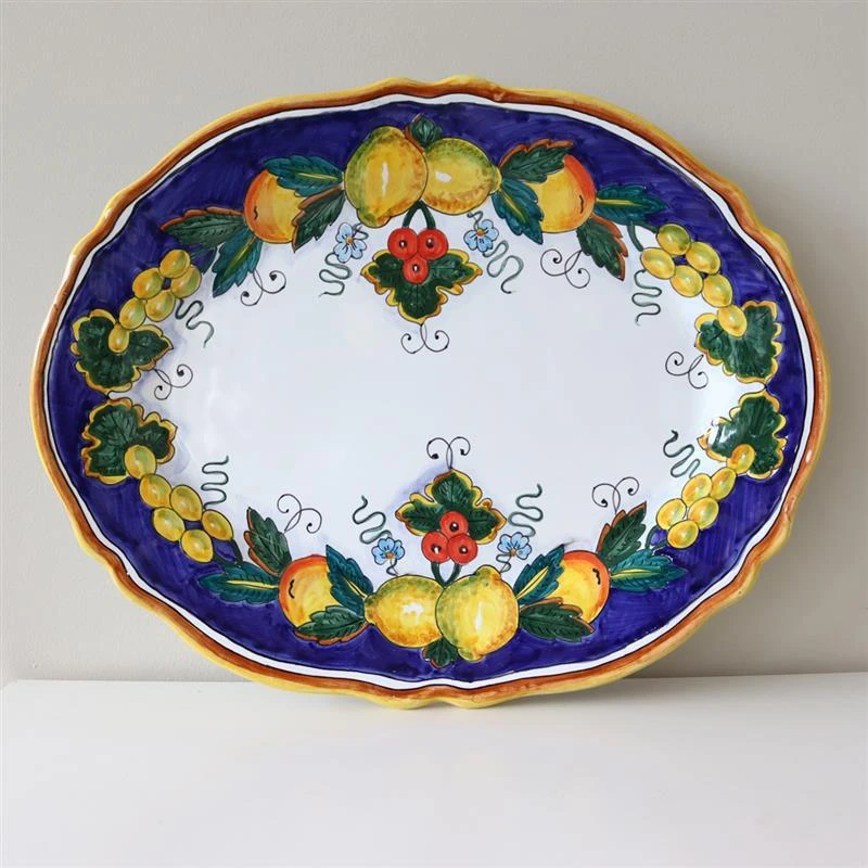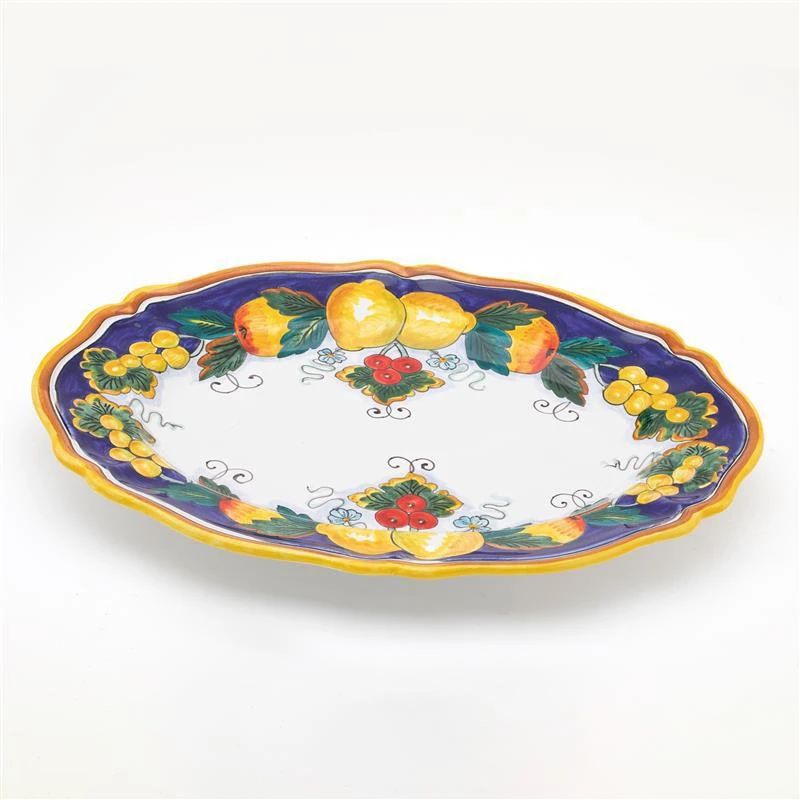 One of Deruta’s most famous motifs involves colorful lemons, berries and grapes against a blue, white and orange background. This motif has inspired our Limone Serving Plate. Made in Italy by some of the country’s finest craftsmen and both dishwasher and microwave safe, the Limone Serving Plate provides a festive backdrop for entertaining, and represents the pinnacle of Italian ceramic artistry.