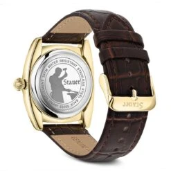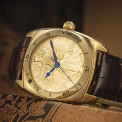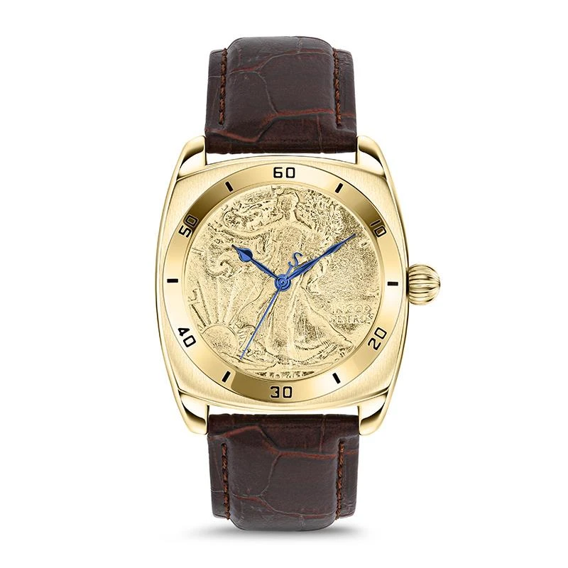 Set inside a cushion case and equipped with a crocodile-embossed brown leather band, the Marching Liberty Watch is an attractive addition to any watch aficionado’s collection.