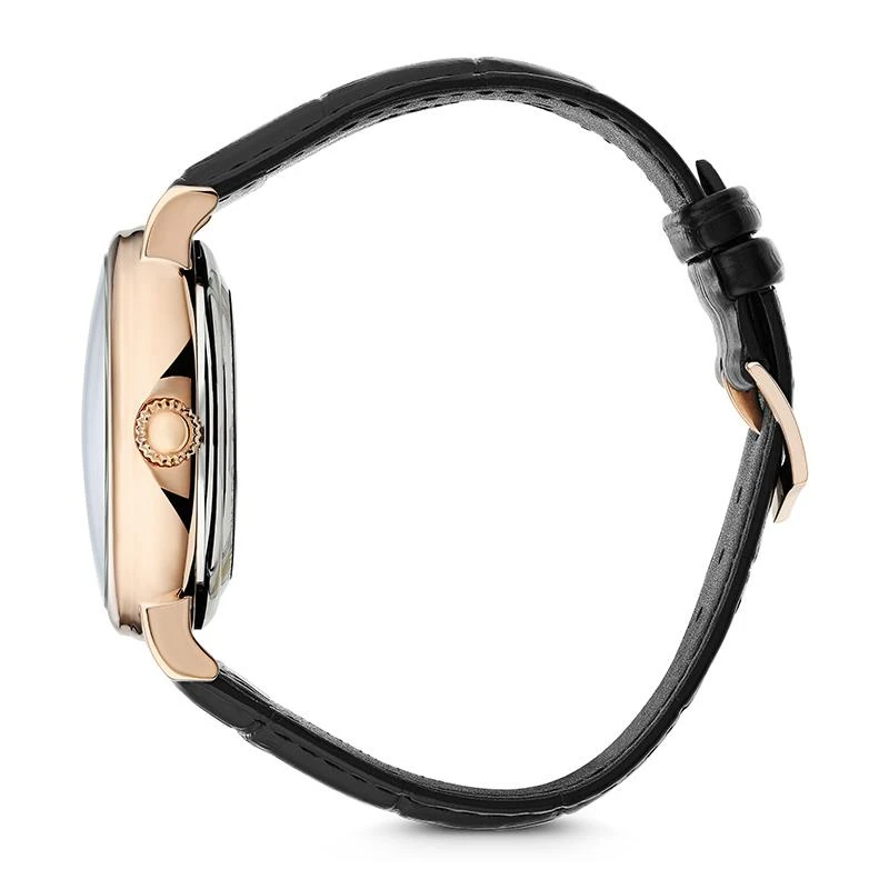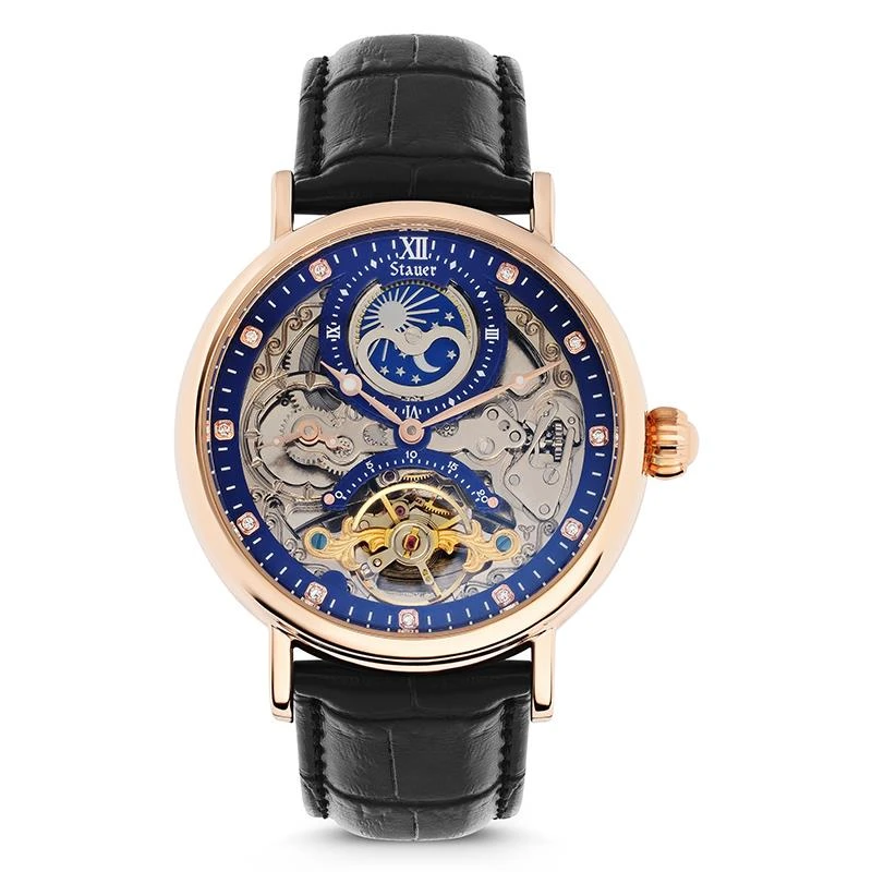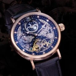 This beautiful piece of art you see here is an automatic skeleton watch, and it has nothing to hide. With the transparent watch face, you can look inside and see what makes this remarkable timepiece tick. You’ll find 20 jewels, the balance wheel, the escapement, and all the other precision parts on display. You’ll also get a good view of how the genius complications work, from the sun moon dial at 12 o’clock to the dual time zone at nine o’clock. You’ll find yourself checking the time more often, just to witness the mechanical genius and stunning aesthetics. This is a watch that elevates the passage of time into an art form. Â
