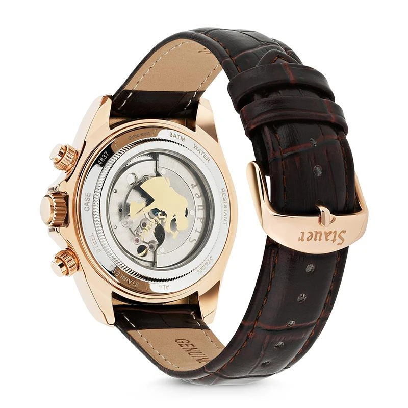 The Speedway Automatic is our tribute to the iconic Daytona watch. This classic timepiece keeps precision time, powered by 27 jewels and your own movement. It features three subdials, pronounced lugs, and a tachymetric bezel designed to measure speed over a fixed distance. We also added a few little luxuries like a mother of pearl dial, a rose-gold finished case, and a crocodile-embossed brown leather strap. Â Â