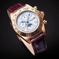 - Month & day of theweek subdials, 24 hour & sun/moon dial at 6 o’clock; date window at 3 o’clock