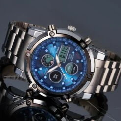 The watch’s handsome steel blue dial seamlessly blends an analog watch face with a stylish digital display. It’s a stopwatch, calendar, and alarm, and a crown coupled with water resistance to 30 meters makes this watch up for under water adventures.Â