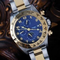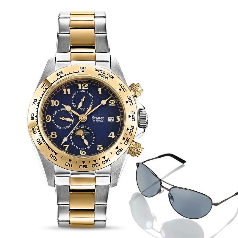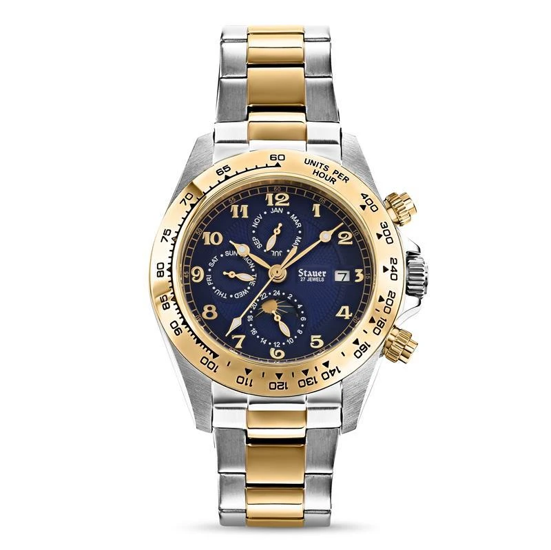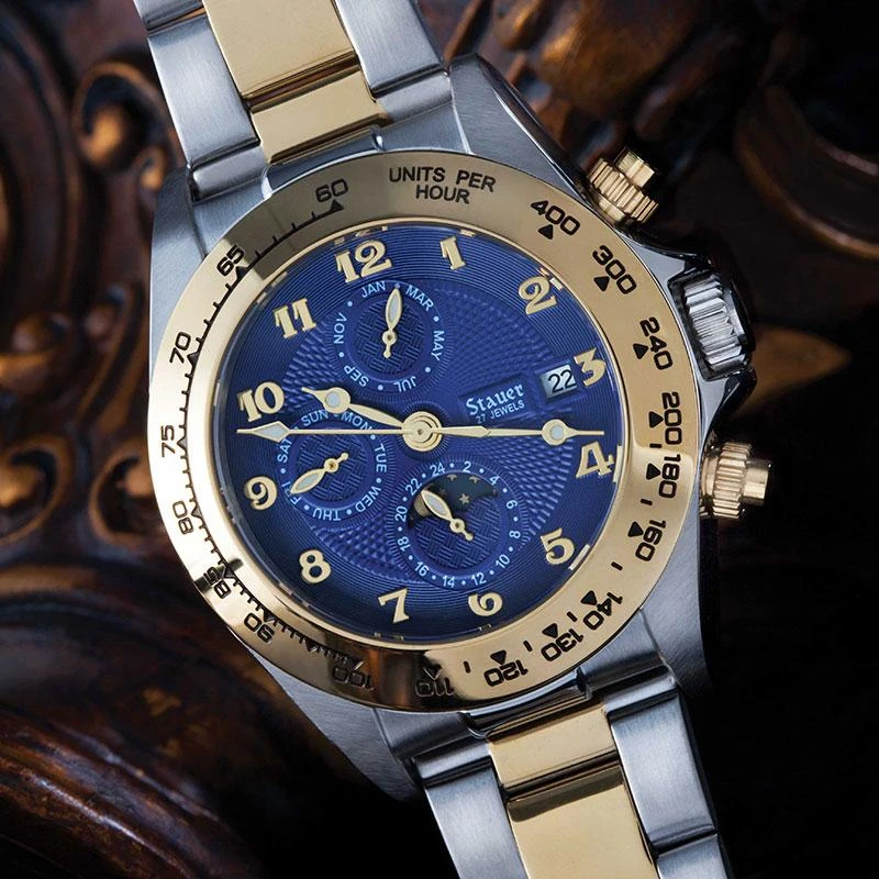 The Stauer Corso is proof that the worth of a watch doesn’t depend on the size of its price tag. Our factory spent over $40 million on Swiss-made machinery to insure the highest quality parts. Each timepiece takes six months and over 200 individual precision parts to create the complex assembly. Peer through the exhibition back to see the 27-jeweled automatic movement in action and you’ll understand why we can only offer the Corso in a limited edition. Our specialty is vintage automatic movements. The Corso is driven by a self-winding design, inspired by a 1923 patent. Your watch will never need batteries. Every second of power is generated by the movement of your body. The blue dial features a trio of date complications including a graphic day/night display. The Corso secures with a two-toned stainless steel bracelet and is water-resistant to 3 ATMs.