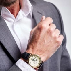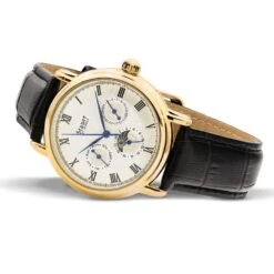 This automatic timepiece is hand built by master craftsmen with state of the art equipment. Look at the interior dials and azure-colored hands. Turn the watch over and examine the 27-jeweled automatic movement through the transparent back. There is a remarkably detailed guilloche face, gilt winding crown, and crocodile-embossed leather band. The three interior dials for day, date, and 24-hour AM/PM indicator. Fits wrists 6½” to 9″.