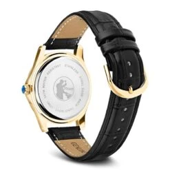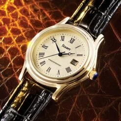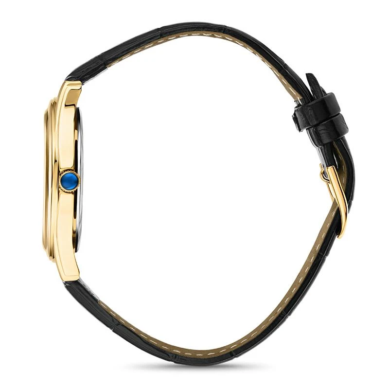Modern technology with a vintage price. The Stauer Metropolitan retains all the hallmarks of a well-bred wristwatch including a gold-finished case, antique ivory guilloche face, blued Breguet-style hands, an easy-to-read date window at the 3 o’clock position, and a crown of sapphire blue. It secures with a crocodile-patterned, genuine black leather strap and is water resistant to 3 ATM.