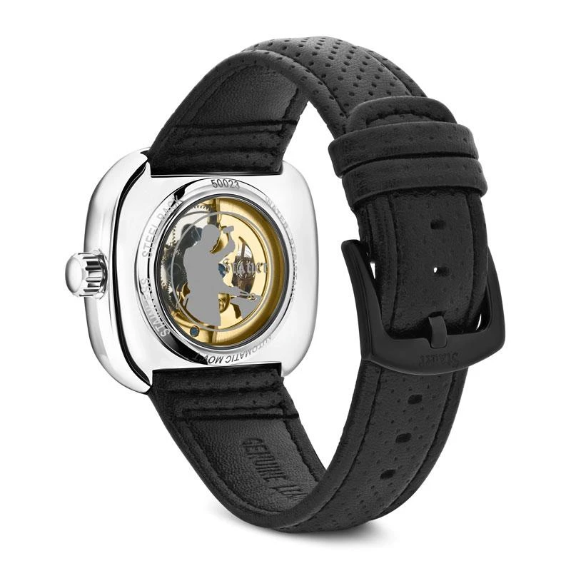 Just look at this wonder: an innovative, state-of-the-art face with the wheel-shaped minute and hour hands; a 21-jewel automatic movement, ensuring that this watch will keep accurate time for ages; a skeleton back and front window that allow you to see the inner-workings of this fine timepiece. Held in place with a stainless-steel construction and a black, genuine leather strap, this watch was built to hold up under pressure.