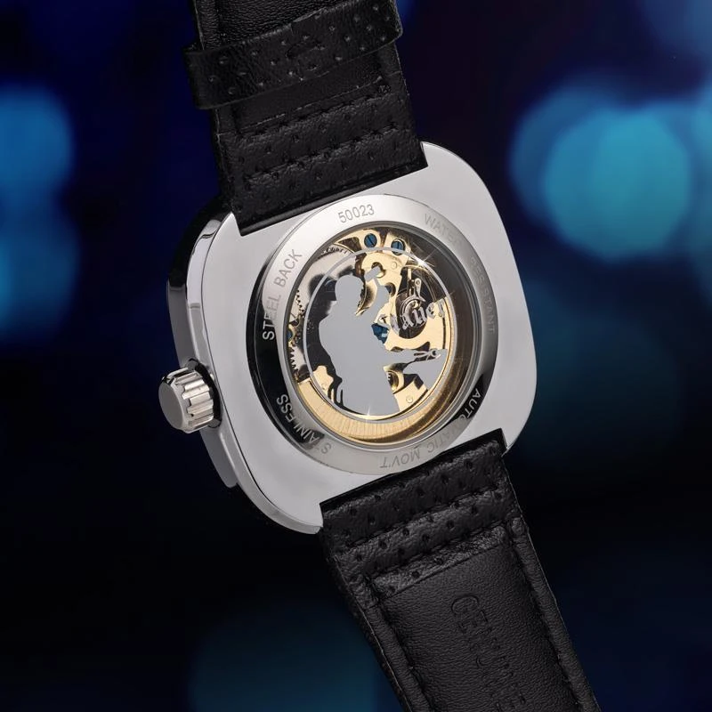 So, ignore those dainty watches with small faces and tiny numerals. Embrace masculinity and modernity with the Square Skeleton Watch, a cushion case automatic timepiece attractively priced!