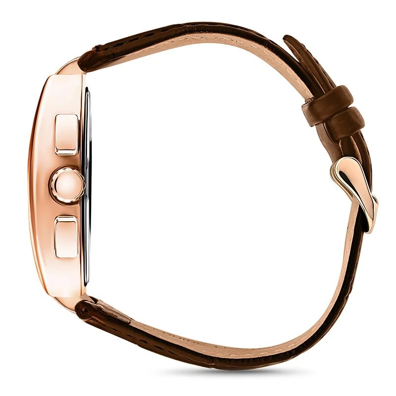 In our update of this classic watch design, we’ve placed a Swiss precision movement under a brass dial and an understated black face. This watch features a date window at 6 o’clock, a stop watch function and water resistance up to 3 ATM. Fitted with a crocodile embossed chocolate leather strap, the Cognac Tonneau is the perfect watch for the manly man who doesn’t mind dressing up from time to time.
